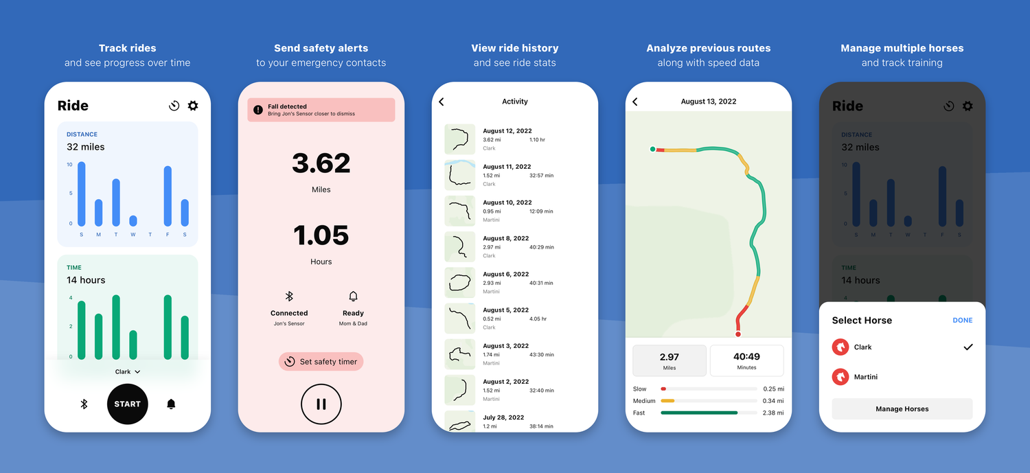 The Adventure SOS mobile app automatically tracks ride time, location, and distance for each ride / hike. The user can set up multiple horses within the app so tracking training and rides for different horses is simple and user-friendly. The Adventure SOS fall detection sensor is NOT required for ride mapping.